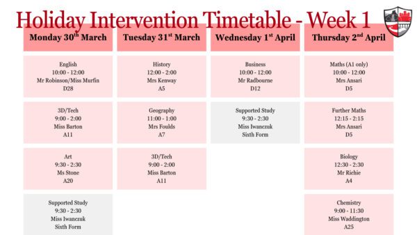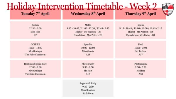 📚✨ Year 11 Easter Intervention Programme ✨📚 We are pleased to be offering a range of Easter holiday intervention sessions to support our Year 11 students in the lead-up to their final exams. Please see the timetable attached for full details of sessions available.